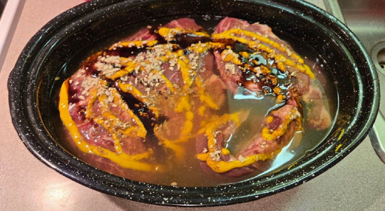 - Déposer la viande dans un plat allant au four et badigeonner généreusement avec la préparation à la moutarde et les sachets à l'oignon.